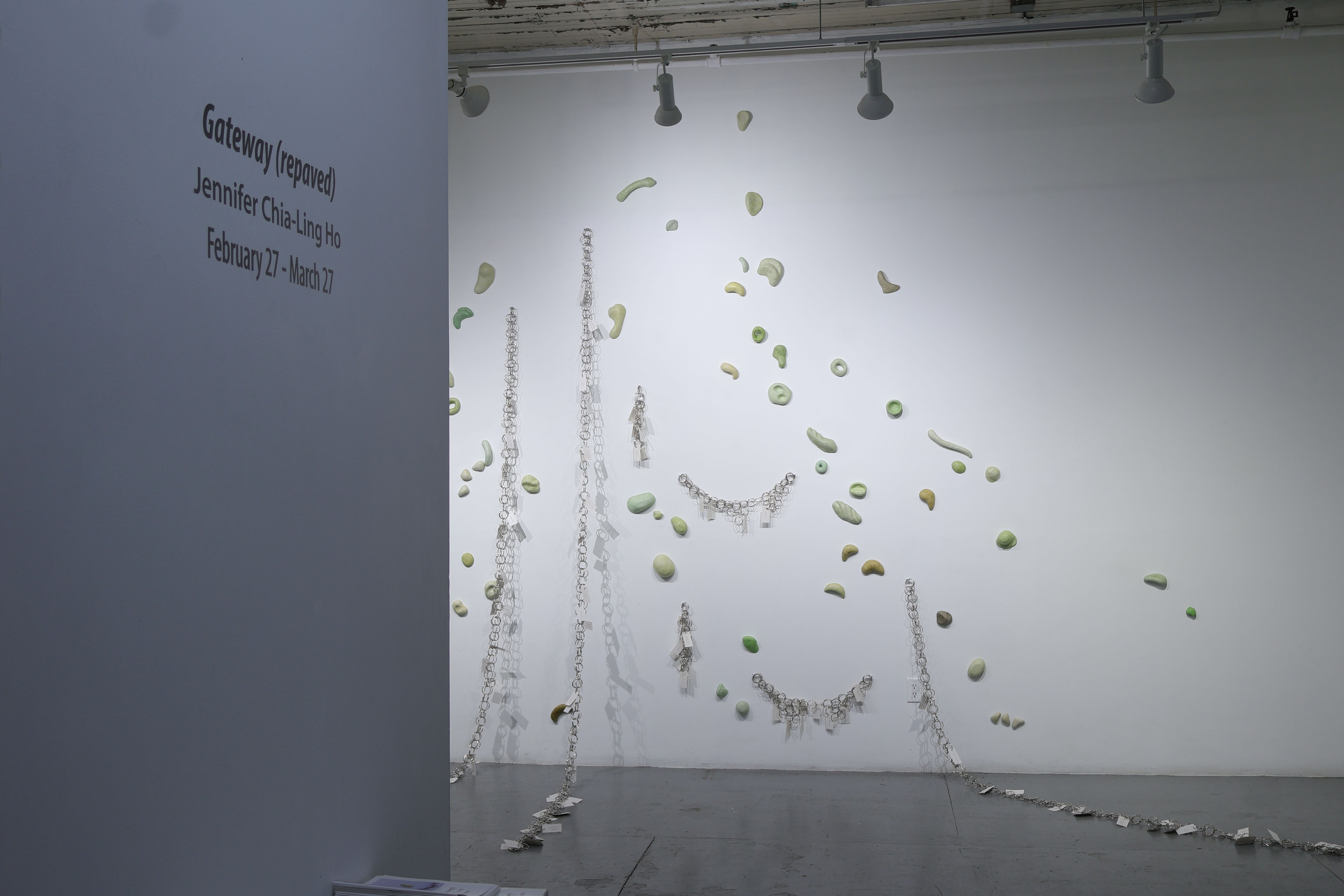 Gateway (repaved) is a site-specific installation inspired by Jennifer Chia-Ling Ho's immigration from Taiwan to the U.S., exploring themes of adaptation and resilience. Transforming the gallery space into a climbing wall with ropes made from English vocabulary flashcards and jade-like rock holds, the work uses the act of climbing as a metaphor for navigating a new environment while staying connected to one’s roots.